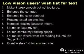 I foolishly didn’t take notes at that session, and Arditi has, for reasons known only to him, not only refused to provide a citation but refused to answer E-mails since then. Nonetheless, I was able to find Arditi’s “Low-vision users’ wish list for text” in another of his presentations, “Web Accessibility and Low Vision,” viewable as a QuickTime movie. His wishlist is as follows: